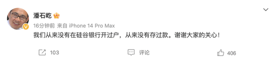 SOHO中国董事长潘石屹在微博上发声,表示未在硅谷银行开过户,没有存过款。