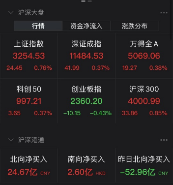 截至上午收盘,上证指数上涨0.76%,深证成指上涨0.37%,创业板指下跌0.43%,北向资金净流入24.67亿元。盘面上,“一带一路”板块走强,数字经济主线盘中爆发,国资云、数据安全等板块涨幅居前。