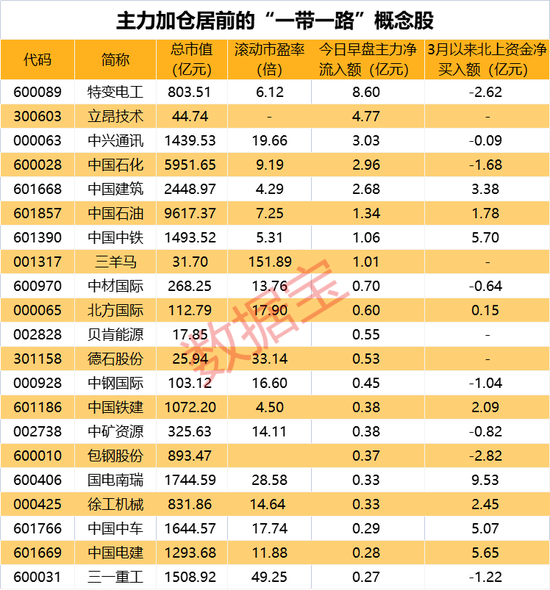 今日早盘,近7成“一带一路”概念股获主力加仓,特变电工、立昂技术、中兴通讯的主力净流入额居前,分别达8.6亿元、4.77亿元和3.03亿元。3月以来,15只概念股获得外资大手笔加仓,北上资金区间净买入额均超亿元,其中,国电南瑞、中国船舶、中国中铁、中国电建、中国中车的北上资金3月以来净买入额均超5亿元。