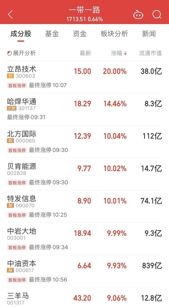 今日“一带一路”概念指数高开高走,立昂技术20cm涨停,北方国际、贝肯能源涨停,三羊马、鼎汉技术、特变电工、德石股份等涨超5%。