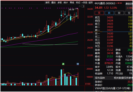 中兴通讯股价大幅上涨,盘中涨幅一度接近6%。