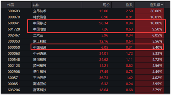 通信板块涨幅居前,几大电信巨头悉数大涨,中国移动尾盘涨停,股价报98.34元,再创上市以来新高,中国移动目前总市值超过万亿元。中国电信大涨9.50%,中国联通上涨5.40%。