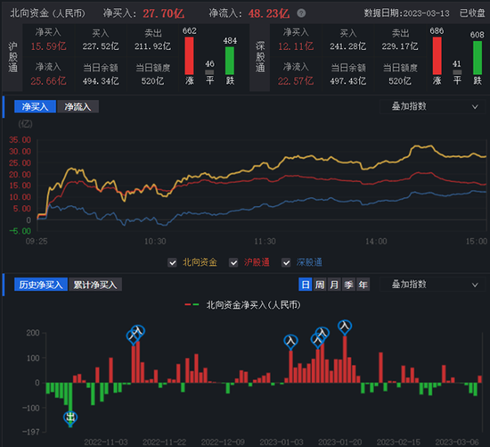 3月13日,沪深两市三大指数震荡分化,沪指表现相对强势,K线呈长阳吞阴形态。截至收盘,上证指数涨1.20%报3268.70点;深证成指涨0.55%报11505.02点,创业板指跌0.56%报2357.07点,A股合计成交额8396.88亿元,较前一交易日缩减3.67%,北向资金净买入27.70亿元,沪股通净买入15.59亿元,深股通净买入12.11亿元。总体上看,A股中上涨个股数量略少,有2342只上涨,2583只下跌。
