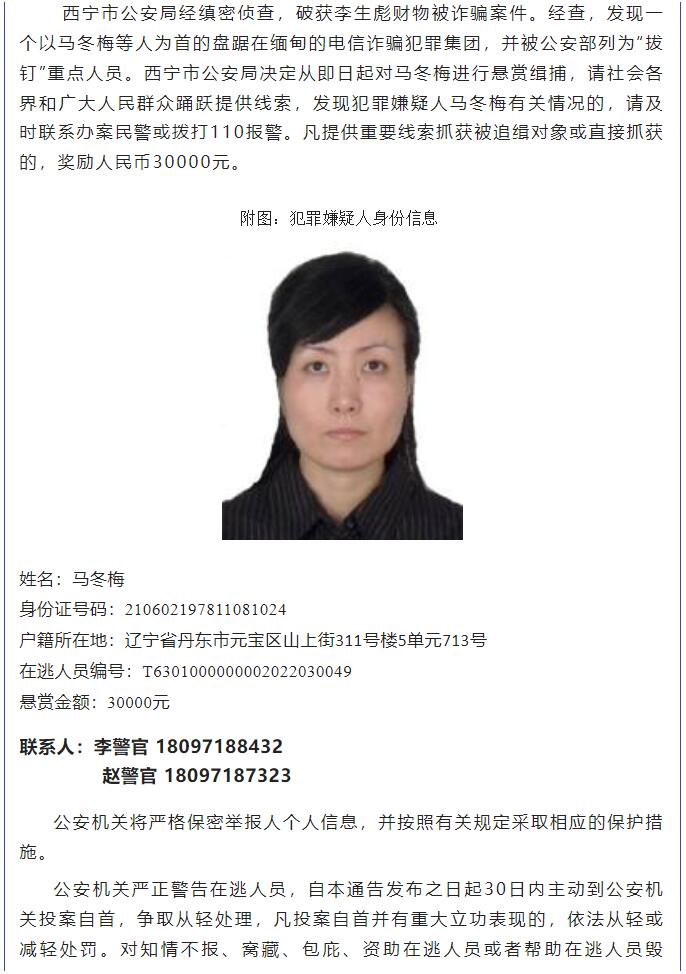 西宁市公安局决定从即日起对马冬梅进行悬赏缉捕,请社会各界和广大人民群众踊跃提供线索,发现犯罪嫌疑人马冬梅有关情况的,请及时联系办案民警或拨打110报警。凡提供重要线索抓获被追缉对象或直接抓获的,奖励人民币30000元。