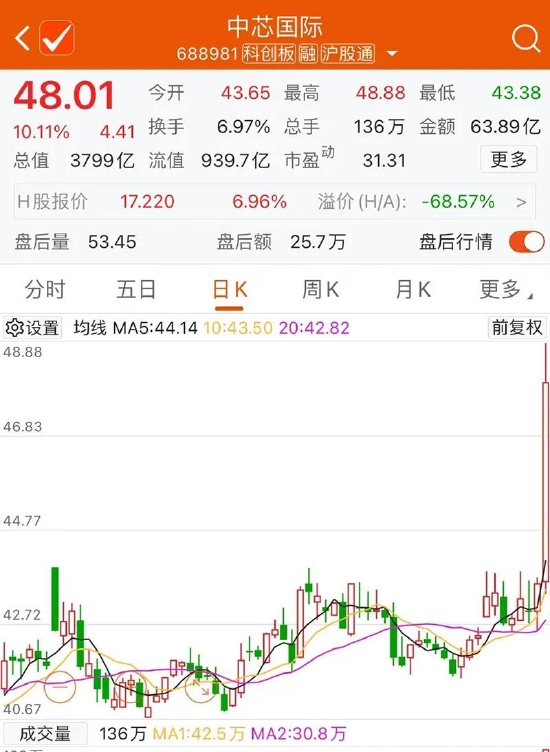 晶圆代工龙头中芯国际表现十分强势,盘中一度涨超12%,带动半导体板块强势上涨。截至收盘,中芯国际上涨10.11%,成交额63.89亿元,最新总市值3799亿元。