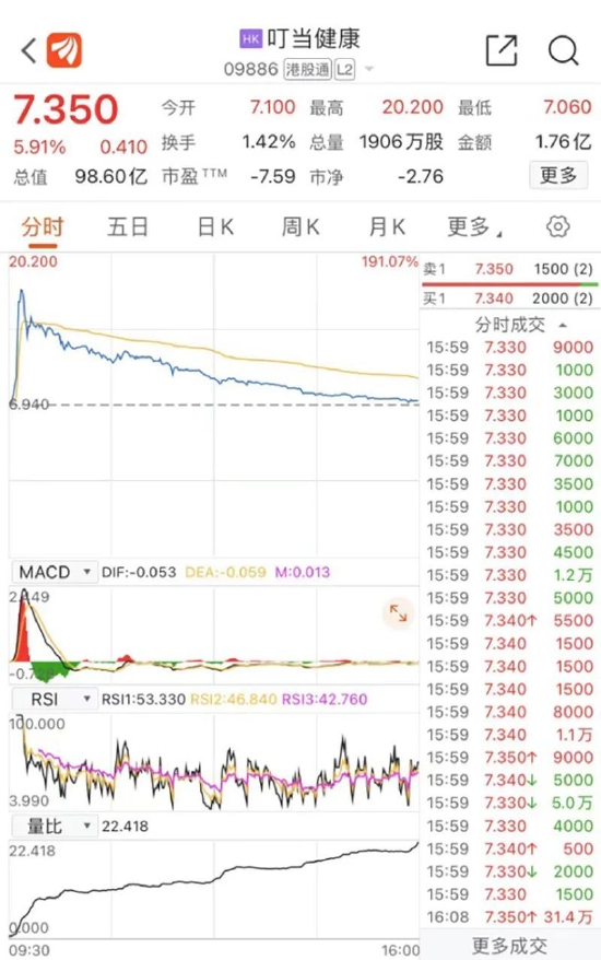 3月14日,互联网医疗在线平台之一叮当健康早盘一度冲高,盘中涨超145%,截至收盘,涨幅收窄至5.91%,报7.35港元,总市值98.6亿港元。