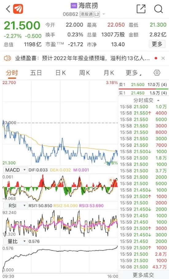 今日收盘,海底捞跌2.27%。开年以来,海底捞股价迎来反弹。2月23日至3月7日,9个交易日海底捞股价反弹23.69%。