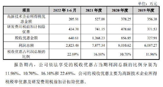 报告期内,公司依法享受的所得税税收优惠金额分别为727.91万元、856.85万元、1,268.23万元和640.61万元,占当期利润总额的比例分别为11.96%、10.70%、16.10%和22.69%。公司收到的政府补助分别为819.27万元、602.72万元、1,135.19万元和309.67万元。税补占比较高。