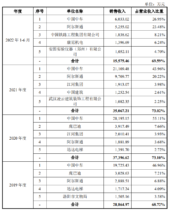 此外,公司大客户集中度较高。报告期内,公司前五大客户销售收入占营业收入的比重分别为68.72%、73.10%、73.02%、69.59%,其中,对中国中车的销售收入占营业收入的比重分别为46.96%、55.11%、43.96%和26.95%。