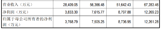报告期内,公司营业收入分别为67,283.46万元、51,642.43万元、56,366.48万元、28,409.05万元,扣非归母净利润分别为14,790.49万元、7,841.48万元、7,412.11万元、3,565.46万元。