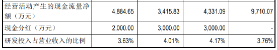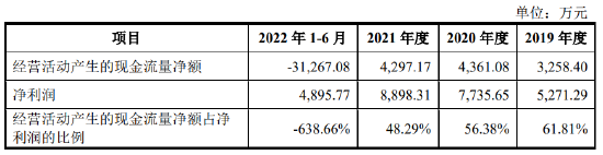 2019年至2022年1-6月,报告期各期公司经营活动产生的现金流量净额分别为3,258.40万元、4,361.08万元、4,297.17万元和-31,267.08万元;货币资金期末余额分别为17,509.27万元、19,799.76万元、20,898.14万元和3,541.12万元,占各报告期末流动资产的比例分别为14.82%、13.40%、10.78%和2.22%。
