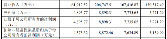 报告期内,公司营业收入分别为130,317.49万元、167,416.87万元、206,747.51万元、61,912.52万元,扣非归母净利润分别为5,159.99万元、7,634.89万元、8,872.46万元、4,375.32万元。