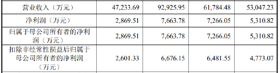 报告期内,公司营业收入分别为53,047.23万元、61,784.48万元、92,925.95万元、47,233.69万元,实现净利润分别为5,310.82万元、7,266.05万元、7,663.78万元、2,869.51万元。