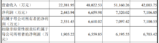报告期内,公司营业收入分别为42,003.75万元、51,160.26万元、48,022.53万元、22,381.95万元,扣非归母净利润分别为6,703.42万元、6,195.55万元、6,559.85万元、1,905.22万元。