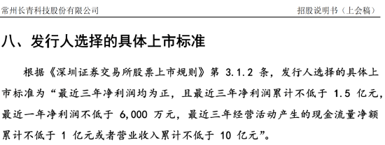 有意思的是,招股说明书披露长青科技选择的具体上市标准为“最近三年净利润均为正,且最近三年净利润累计不低于1.5亿元,最近一年净利润不低于6,000万元,最近三年经营活动产生的现金流量净额累计不低于1亿元或者营业收入累计不低于10亿元”。