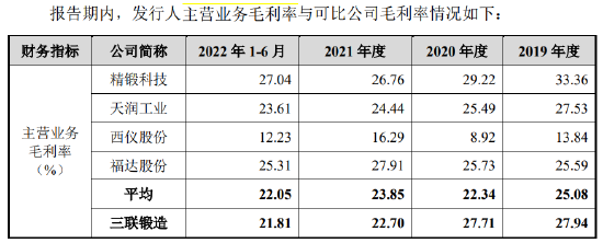 公司综合毛利率分别为26.76%、26.64%、21.15%、20.41%,其中主营业务毛利率分别为27.94%、27.71%、22.70%、21.81%。与可比公司相比,公司的毛利率一路下滑。