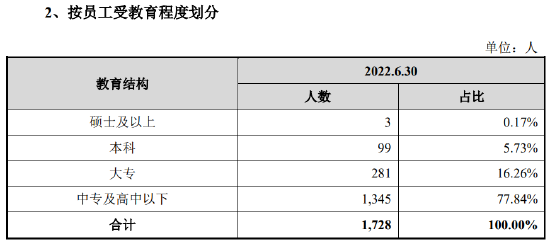 截至2022年6月末,公司员工共1728人,其中研发人员201人,占比11.63%,管理人员116人,占比6.71%,不过其员工学历并不高,硕士及以上仅3人,占比0.17%,本科及以上为99人,中专及高中以下为1345人,占比77.84%。