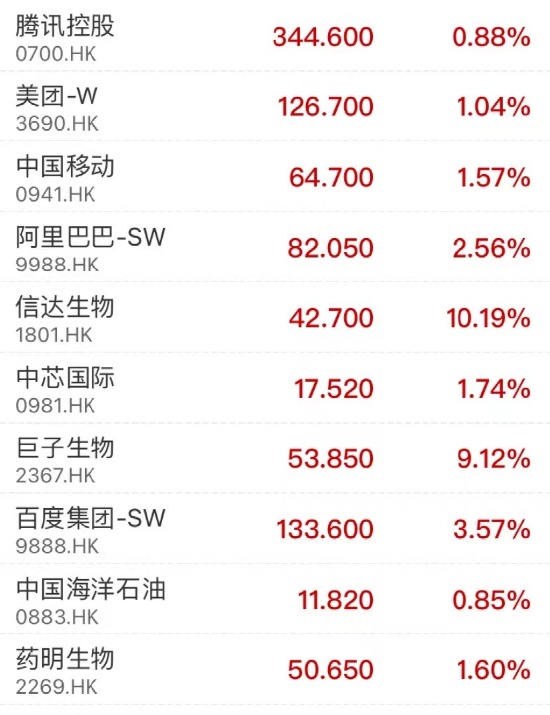 医疗保健股大涨,中科生物涨近140%,博安生物、诺辉健康、信达生物等医药股大幅收涨;互联网医疗股爆发,平安好医生涨超10%,阿里健康涨近6%,但叮当健康收跌约35%,近两日盘中巨震;港口运输股上涨,东方海外国际涨近9%领涨蓝筹;内房股上涨,佳兆业集团涨27.69%,龙光集团涨14.63%,融信中国涨11.48%。