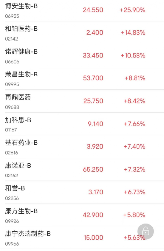 博安生物-B一度飙涨近85%,收涨近26%;和铂医药-B涨近15%,诺辉健康-B收涨近11%,荣昌生物-B、再鼎医药涨超8%,加科思-B、基石药业-B、康诺亚-B涨超7%、和誉-B涨超6%、康方生物-B涨近6%。