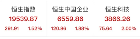 港股今日早盘强势拉升,涨幅一度扩大至2%,三大指数触及日高后涨幅有所收窄,但最终集体收涨。截至收盘,恒生指数收涨1.52%,涨291.91点,报19539.87点;恒生科技指数涨2%,报3866.26点;恒生国企指数涨1.88%报6559.86点。