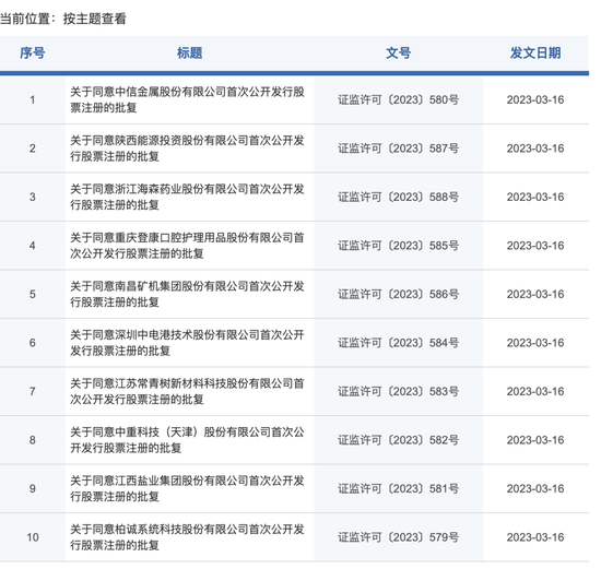 全面注册制下首批主板IPO注册生效企业出炉!3月16日,证监会同意10家主板企业IPO注册,沪深主板分别为5家,包括中信金属、江盐股份、常青科技、中重科技、柏诚股份、中电港、陕能股份、海森药业、登康口腔、南矿集团,共10家企业。