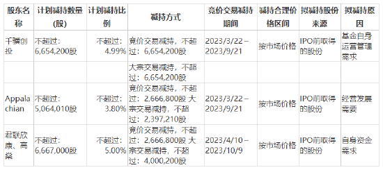 具体来看,千骥创投、Appalachian拟进行“清仓式”减持,减持股数分别不超过665.42万股、506.4万股;君联欣康和高燊拟合计减持不超过666.7万股,3家机构股东合计减持比例不超过公司总股本的13.79%。在本次减持完成后,千骥创投、Appalachian不再持有公司股份,君联欣康和高燊持股比例降至1.57%。