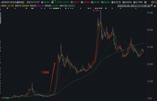 2020年11月底,收购红星股份(红星二锅头母公司)的公告发布后,大豪科技一改此前备受市场冷落的颓势,股价连续飘红,迭创历史新高,连拉12个涨停板。