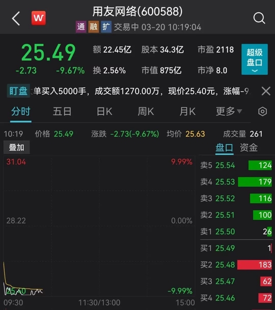 3月20日,主打ERP系统的工业互联网龙头用友网络开盘之后快速跳水,盘中跳水触及跌停,成交金额超15亿。