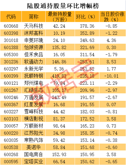 增仓幅度来看,持股量环比增幅在50%以上的共有122股,环比增幅最大的是天马科技,北上资金最新持有42.24万股,持股量环比增幅达378.36%。昨日该股下跌0.85%,全天换手率为1.56%,主力资金净流出1177.83万元。