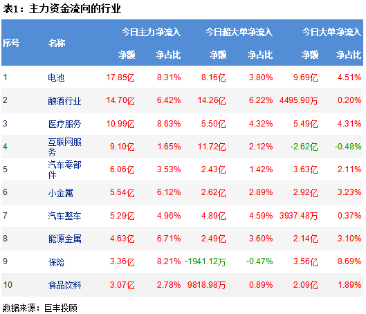 从两市行业板块资金流向来看,电池板块获主力资金净流入17.85亿,酿酒板块获主力资金净流入14.70亿,医疗服务板块主力资金净流入10.99亿,互联网服务板块主力资金净流入9.10亿,汽车零部件板块主力净流入6.06亿。