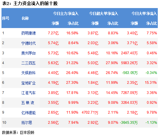 从两市个股主力资金流向来看,药明康德(维权)获主力资金净流入7.27亿,宁德时代获主力资金5.74亿净流入,贵州茅台获主力资金净流入5.73亿,二三四五获主力资金净流入5.63亿,天娱数科(维权)获主力资金净流入4.40亿。
