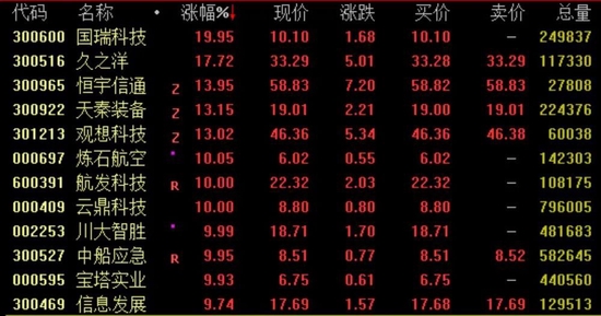 军工板块盘中走势强劲,截至收盘,国瑞科技“20cm”涨停,恒宇信通、观想科技涨超13%,炼石航空、航发科技、川大智胜、宝塔实业等涨停,永兴材料涨近8%。