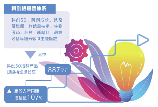 A:目前,科创板已有科创成长指数、科创50指数和反映不同行业走势的5个主题指数:科创高装指数、科创新材料指数、科创芯片指数、科创生物医药指数和科创新一代信息技术指数,初步构建了覆盖规模、主题、策略等类别的科创板指数体系。其中,科创50指数产品规模持续增长至887亿元,相较去年同期增幅达107%。
