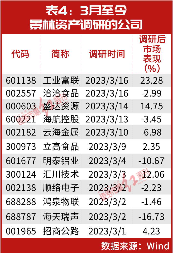 而仅从3月份以来的数据统计,景林资产的调研步伐也开始有所加快,期间共对12家公司进行了调研(见表4)。高瓴资本年内的调研则多来自前两个月份,3月份仅调研了天奈科技1家公司。