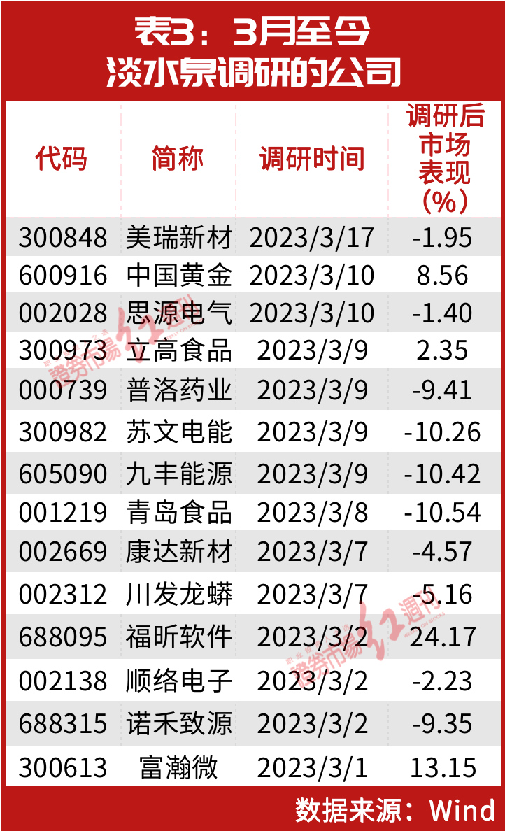 由赵军掌舵的淡水泉,年初以来的调研目标也相对较多,目前已对130家公司进行了157次调研,3月份至今,即完成了对14家公司的调研(见表3)。从年初调研情况来看,普联软件、苏文电能分别被调研了4次,维峰电子也被调研了3次。其中普联软件自1月31日被调研至今,已录得10.4%的阶段涨幅。