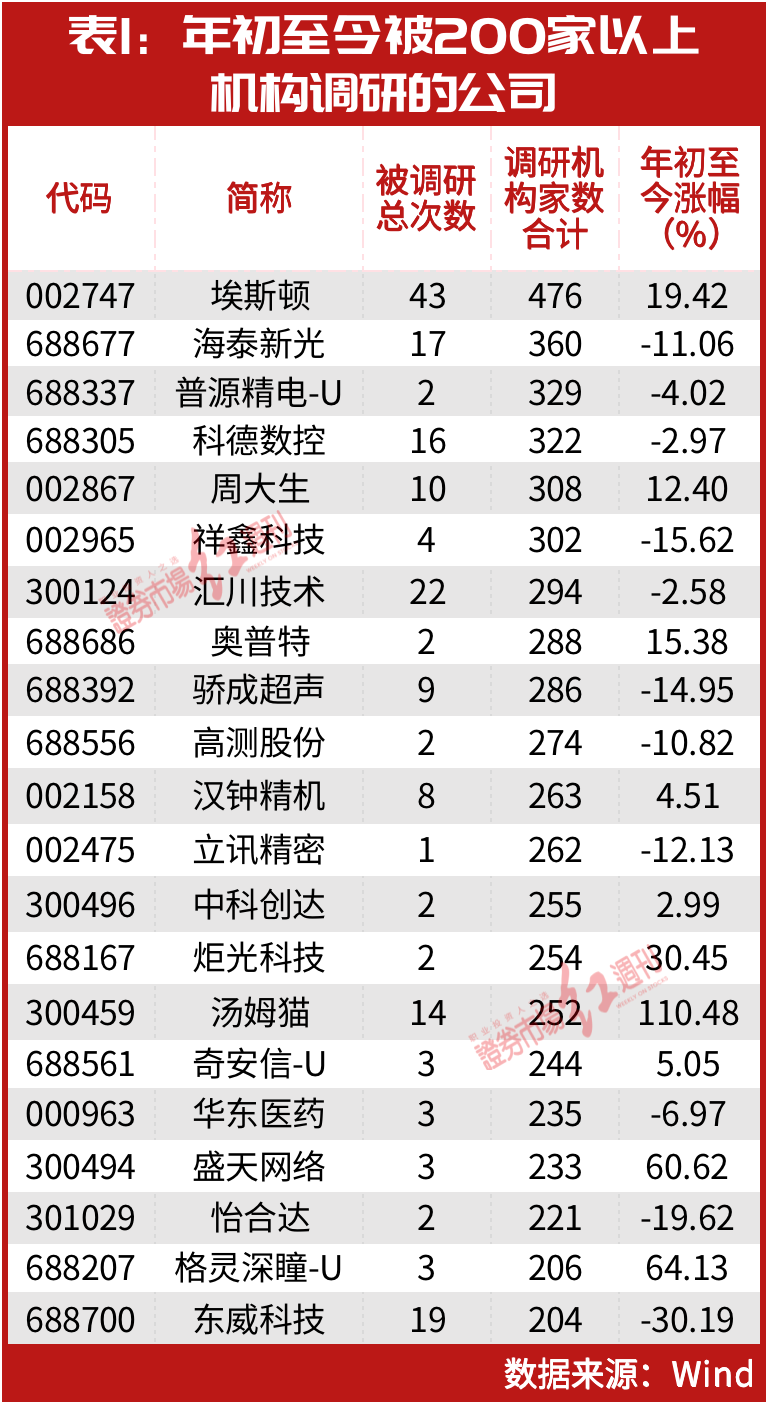 具体至个股,今年以来,有103家公司得到了超百家机构的集中关注,人工智能概念股埃斯顿受到的关注度最高,合计被476家机构关注,先后调研次数达43次。此外,专精特新医疗设备公司海泰新光、芯片概念股普源精电-U、航天军工概念股科德数控等5家公司,年初以来参与调研公司的机构家数也均超过了300家(见表1)。