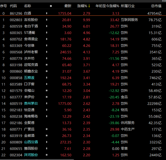 以白酒为代表的消费股也表现不错,贵州茅台收涨2.62%报1775元/股,五粮液收涨3.41%报192.24元/股。
