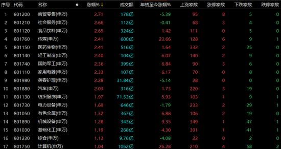 31个申万一级行业中共计25个飘红,大消费领涨,军工、汽车、电力设备也表现不错,商贸零售、社会服务、食品饮料、传媒、医药生物、轻工制造等板块涨逾2%。