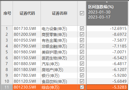 A股前期震荡反弹后,出现持续回调,加上硅谷银行破产及瑞士信贷危机事件加剧市场恐慌情绪,1月30日至3月17日,电力设备板块跌近13%,商贸零售、美容护理、医药生物、食品饮料板块跌幅均超过5%,受此拖累,期间创业板指累计跌逾11%。近两日才出现触底反弹表现。