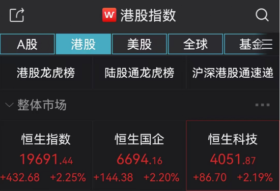 盘中港股市场持续大涨,截至发稿,港股三大指数涨幅均超2%。
