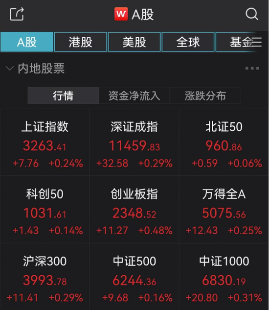 3月22日上午,A股各主要指数小幅高开:上证指数涨0.24%,深证成指涨0.29%,创业板指涨0.48%。