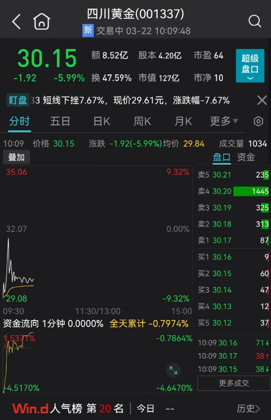 此前成功实现13连板的新股四川黄金,今日上午低开8.95%,盘中跌幅一度超9%。截至发稿,四川黄金跌幅仍近6%。