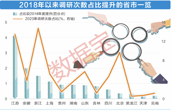 提升幅度最明显的是长三角地区,江苏、安徽、浙江、上海4个省市上市公司2023年以来的调研次数占比,较2018年均提升1个百分点以上,提升幅度排在前4位。