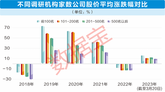 2022年A股市场再次走弱,上证指数当年跌幅15.13%,参与调研的机构家数排名前100的公司平均仅下跌7.9%,跑赢上证指数超7个百分点。2023年以来(截至3月20日,下同),参与调研的机构家数排名前100的公司平均涨幅为16%,而同期上证指数上涨4.71%,跑赢超11个百分点。