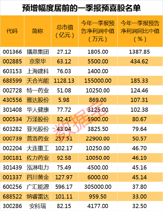 业绩预喜公司中,以预计净利润中值统计,有7家公司一季度净利润超亿元,包含广汇能源、天合光能和普洛药业等。