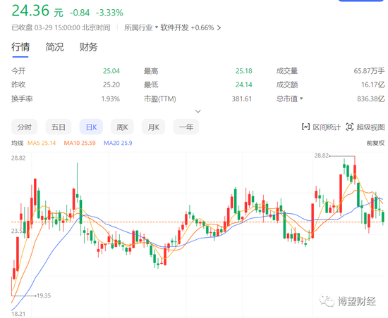 除了盈利能力下滑外,3月20日用友网络还因华为入局ERP市场而快速跳水触及跌停。当日用友网络股价开盘跳水,短短10分钟就触及跌停。此后几日股价投资者仍未恢复信心,截至发稿时当天收盘于24.36元/股。