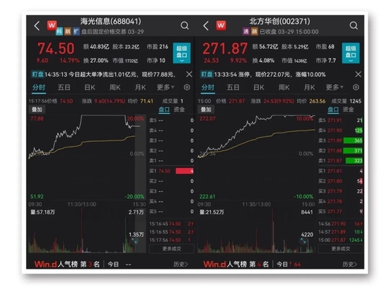芯片股今日大幅走强,两市涨幅居前的板块,大多为芯片相关。具体个股方面,两只市值超过千亿的龙头个股,海光信息盘中20CM涨停,北方华创午后一度涨停,但均在尾盘炸板。