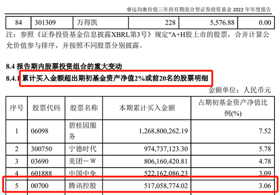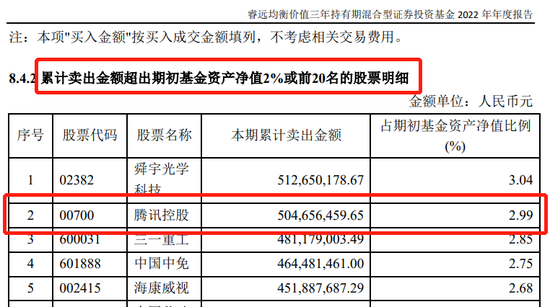 另一方面,2022年该基金累计卖出最多的前五只个股分别为舜宇光学科技、腾讯控股、三一重工、中国中免、海康威视。值得注意的是,腾讯控股同时遭遇了该基金的大幅买入和卖出,2022年累计买入金额为5.17亿元,累计卖出金额为5.05亿元。而该基金2022年中报显示,其持仓明细中并无腾讯控股,2022年上半年累计卖出腾讯控股3.69亿元。截至2022年末,该基金持有腾讯控股119.75万股。