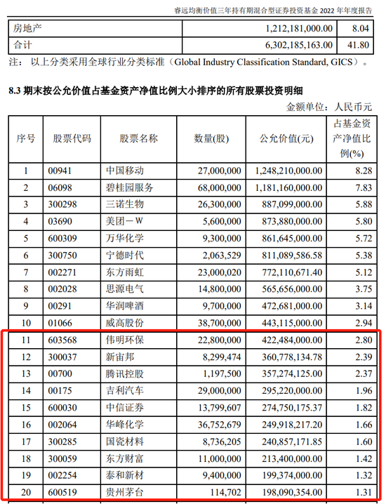 2022年年报显示,基金经理赵枫管理的睿远均衡价值三年持有混合“隐形重仓股”分别为伟明环保、新宙邦、腾讯控股、吉利汽车、中信证券、华峰化学、国瓷材料、东方财富、泰和新材、贵州茅台。