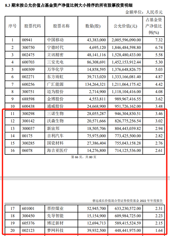 年报显示,截至2022年末,公司副总经理傅鹏博和基金经理朱璘管理的睿远成长价值混合“隐形重仓股”(排名在第11-20位的重仓股)分别为三诺生物、沃森生物、新宙邦、吉利汽车、国瓷材料、海吉亚医疗、晋控煤业、先导智能、博迁新材、梦网科技。